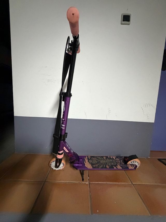Monopatín de la marca Oxelo en color morado. - Diseño con ruedas naranjas. - Plataforma con estampado. - Puños de color rosa.