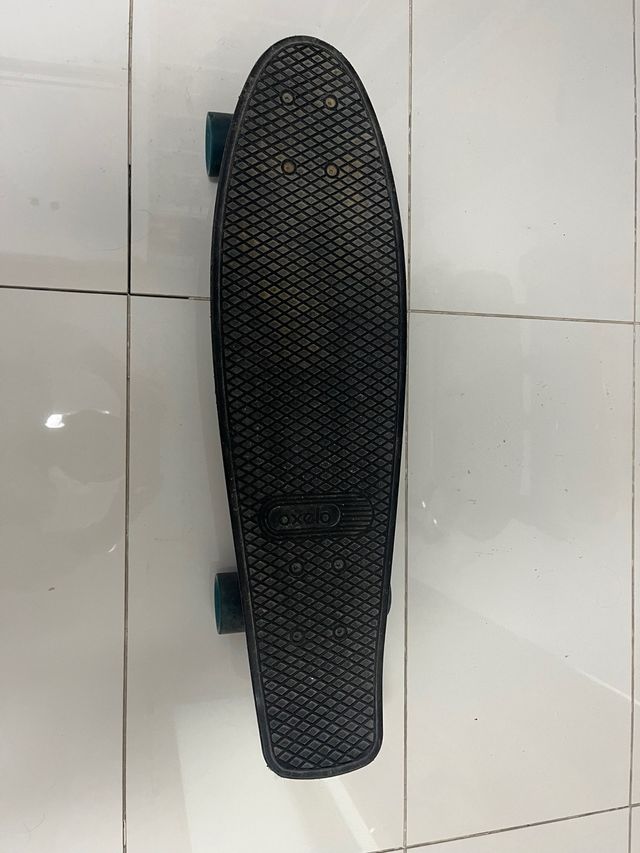 Monopatín de la marca Oxelo en color negro. Perfecto para desplazamientos urbanos. - Diseño clásico y resistente. - Ruedas de color azul.