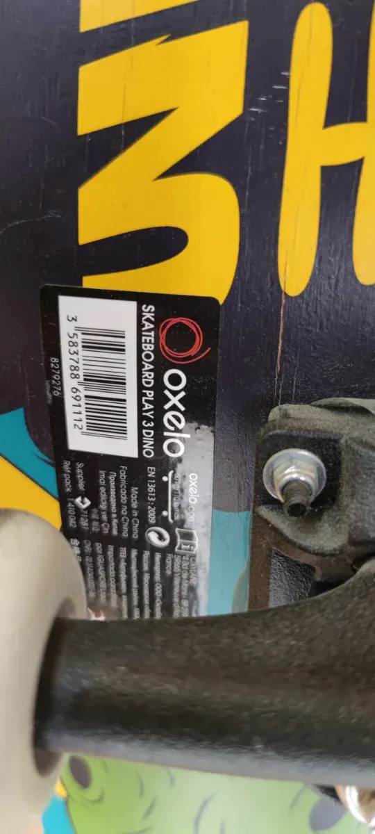 Monopatín Oxelo Play 3 Dino. - Diseño con temática de dinosaurios. - Fabricado en China. - Cumple con la norma EN 13613:2009.