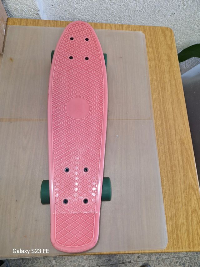 Monopatín OXELO de color rosa, en buen estado. - Ideal para principiantes. - Color rosa pastel. - Diseño clásico. Medidas 56x14,5cm.