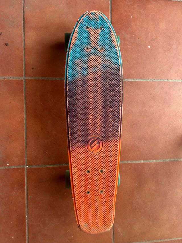 Detalles del productoMonopatín Oxelo con un diseño tricolor degradado y ruedas verdes.