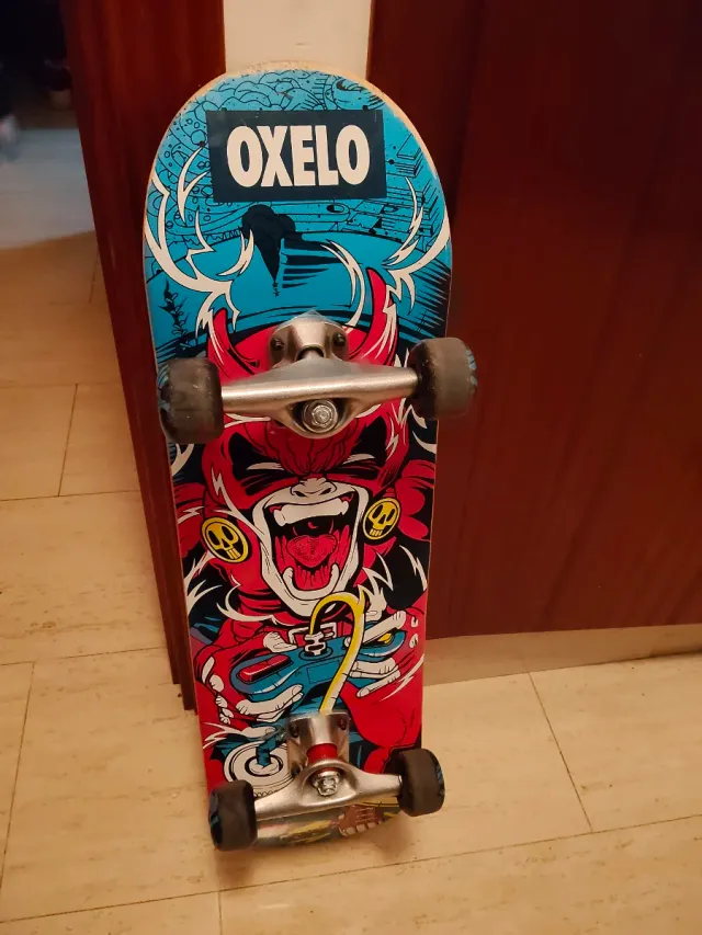 Detalles del productoMonopatín de la marca Oxelo, de Decathlon. Presenta un diseño llamativo con un estampado de demonio y detalles en rojo, azul y blanco.