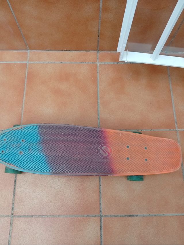 Detalles del productoMonopatín tipo Penny Board con un diseño degradado de colores vibrantes.