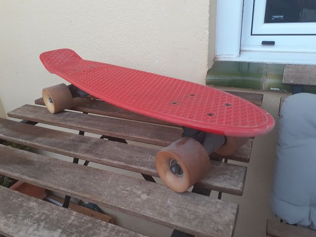 Monopatín tipo Penny Board de color rojo. Ideal para desplazamientos cortos y trucos básicos. - Tabla de plástico resistente. - Ruedas de color marrón.