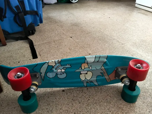 Monopatín tipo Penny con un divertido diseño. - Tabla de color azul turquesa. - Ruedas rojas y verdes. Negociable