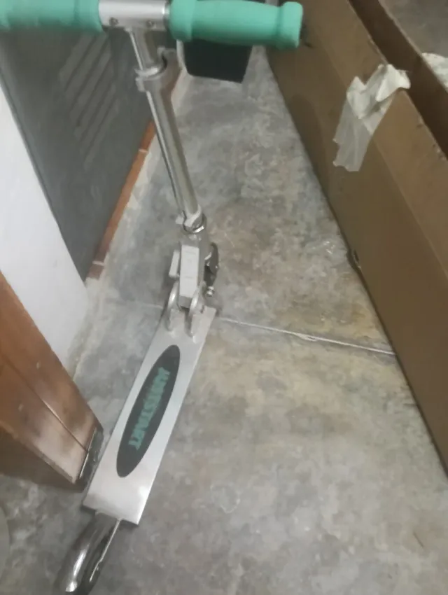 Detalles del productoMonopatín de estilo clásico con un acabado plateado brillante y detalles en verde.