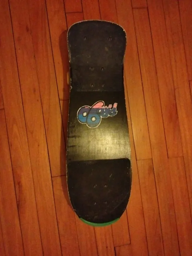 Monopatín con diseño llamativo. - Base negra. - Diseño gráfico en el centro.