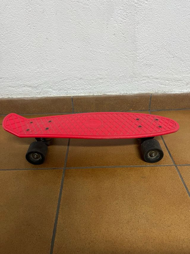 Monopatín de color rojo. - Ruedas negras. - Tabla con textura antideslizante.