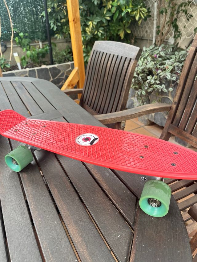 Monopatín clásico de color rojo, perfecto para desplazamientos urbanos o para iniciarse en el skate. - Tabla de 55 cm de longitud. - Ruedas de PVC de color verde.