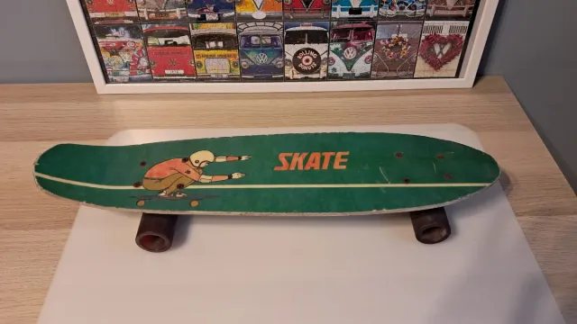 Detalles del productoMonopatín antiguo con diseño gráfico de un patinador y la palabra SKATE , años 70,80...las fotografías forman parte de la descripción de su estado..