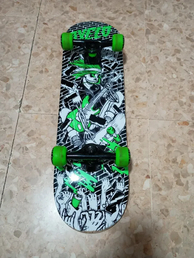 Monopatín skateboard medidas 70x20 con un diseño de esqueleto rockero. Poco usado.
