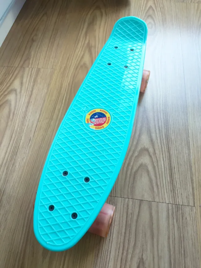 Monopatín de color turquesa con ruedas naranjas. - Diseño clásico. - Superficie texturizada para mayor agarre. - Ruedas de plástico translúcido.
