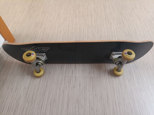 Monopatín en buen estado, listo para usar. - Marca: parece ser una marca poco conocida. - Color: negro con ruedas amarillas. - Ideal para principiantes o para uso recreativo.