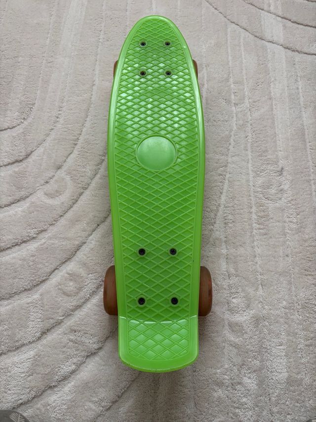 Monopatín tipo penny board de color verde brillante. Ideal para desplazamientos cortos y diversión. - Tabla de plástico resistente. - Ruedas de color marrón.