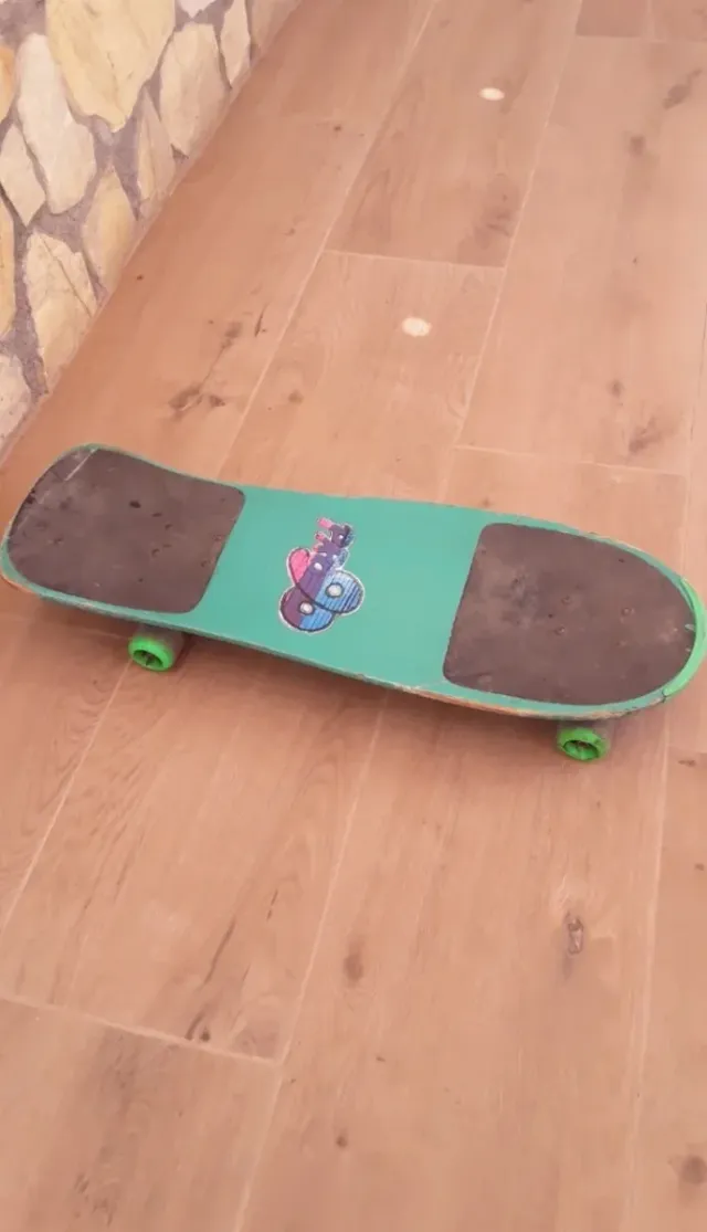 Monopatín de color verde con un diseño llamativo en el centro. - Ruedas de color verde. - Superficie antideslizante en los extremos.