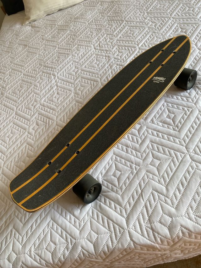 Monopatín Yamba Oxelo con diseño clásico. - Tabla con lija negra y dos líneas amarillas. - Ruedas negras.