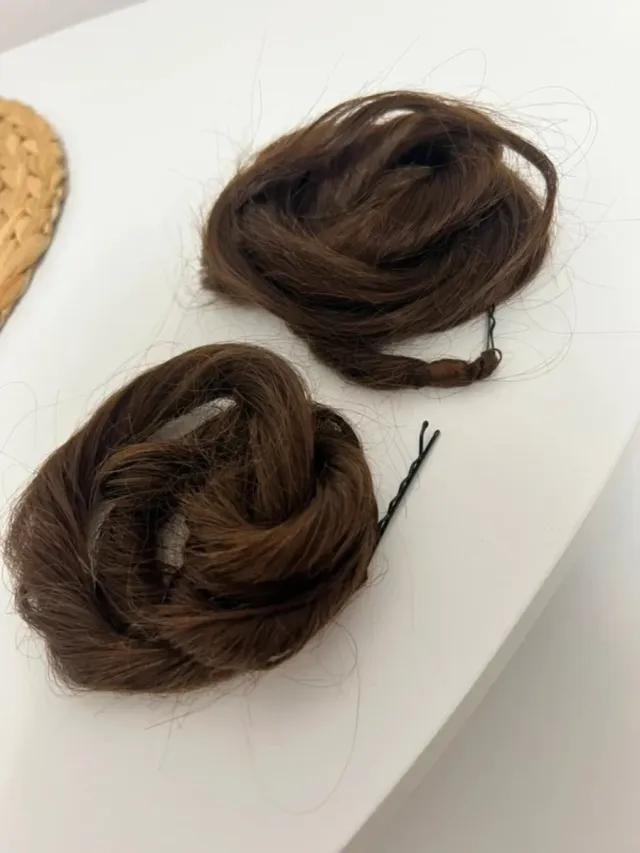Detalles del productoDos moños naturales de pelo castaño, ideales para trajes de fallera o peinados tradicionales.