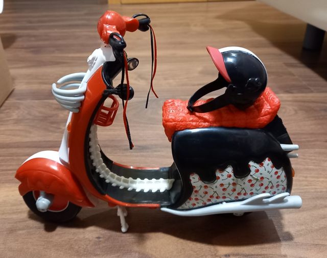 Moto vespa Monster High primera edición, con caballete. Incluye mochila, 1 casco con gafas para la muñeca y 1 casco con gafas para la mascta.