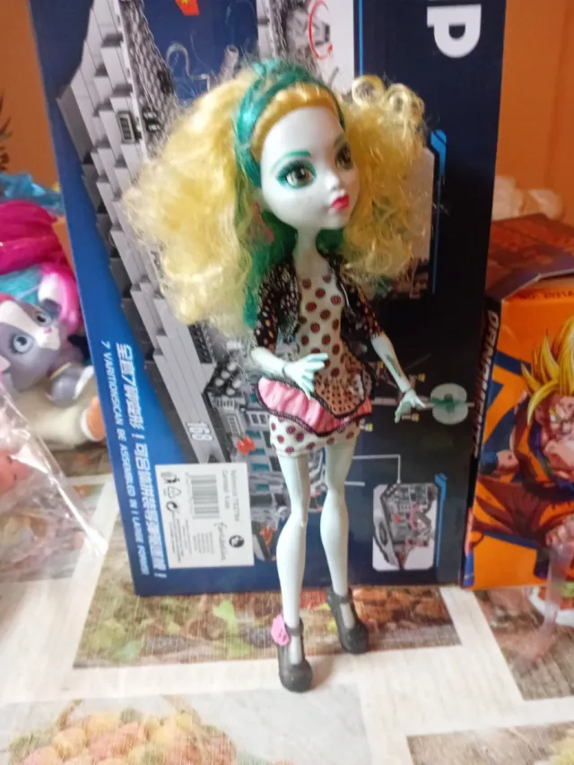 Detalles del productoMuñeca Monster High de Lagoona Blue. Tiene el pelo rubio con mechas verdes y ojos verdes.