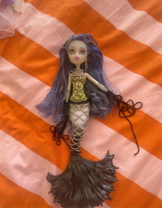 Detalles del productoMuñeca Monster High Hibrida, modelo Sirena Von Boo. Tiene el pelo largo y ondulado en tonos azules y morados. Su atuendo es un top verde con detalles plateados y una falda escamada que se transforma en cola de sirena.