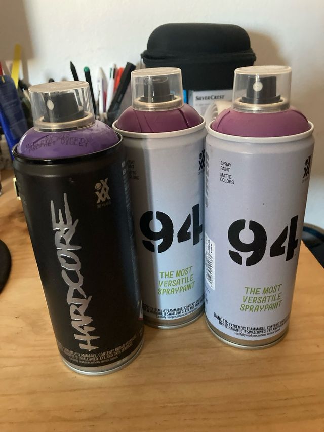 Tres botes de pintura en spray Montana Colors 94 de color lila. Están nuevos. - Tres botes de pintura en spray. - Color lila. 1 brillo 2 mate