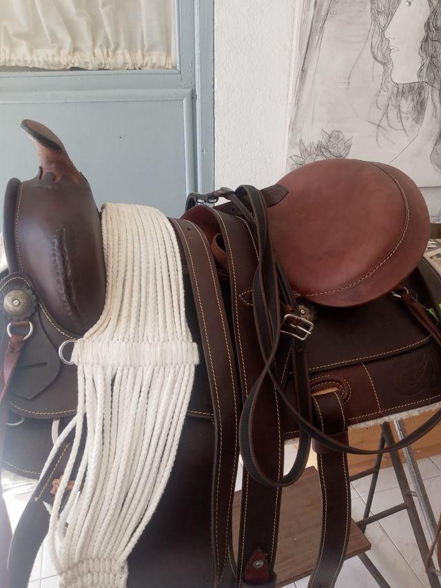Detalles del productoMontura de caballo de cuero marrón, sin estrenar. Es una montura de estilo occidental, ideal para principiantes o jinetes ocasionales.
