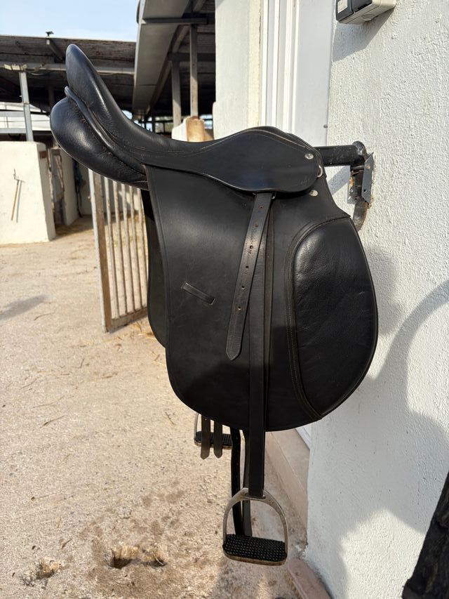 Montura de equitación de estilo inglés, apta para uso general. Fabricada en cuero negro. - Diseño clásico. - Asiento cómodo. - Estribos metálicos con goma.