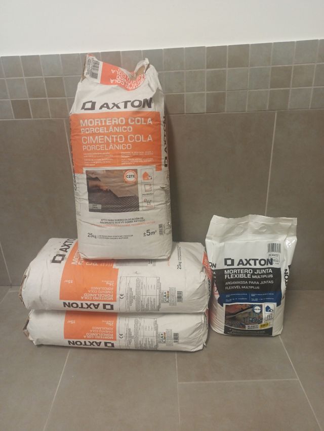 Detalles del producto3 sacod de 25 kilos cada uno de mortero cola porcelánico, uno gris y dos blancos y saco de 4 kilos de mortero para juntas flexible de color blanco. Para recoger, no se envia.