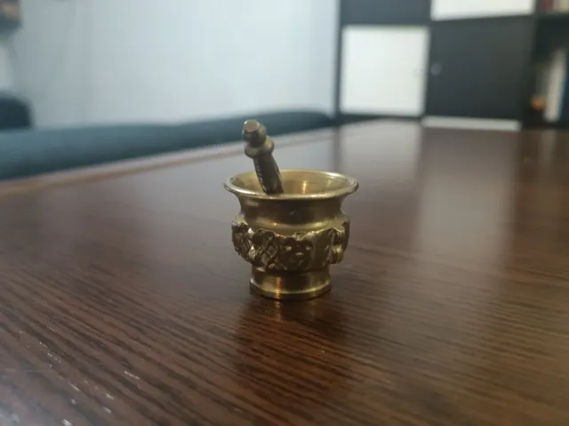 Detalles del productoPequeño mortero bronce Almirez de cuatro costillas y relieves decorativos