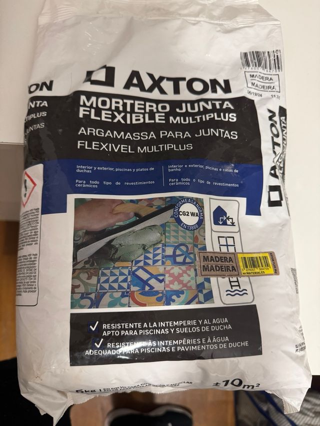 Detalles del productoMortero para juntas flexible de la marca Axton, modelo Multiusos.