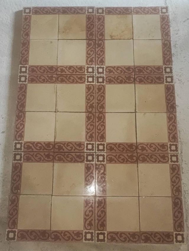Detalles del productoPaño de baldosas de pavimento hidráulico. Aprox. 14m2, con 340 piezas de 20x20x2cm y unas 20 piezas parciales. Marca en el dorso del fabricante: Mosaicos Olivella – Vilafranca. Buen estado general con algunos desperfectos ocasionados por el uso y antigüedad (circa 1930). Piezas de 20x20x1,7cm