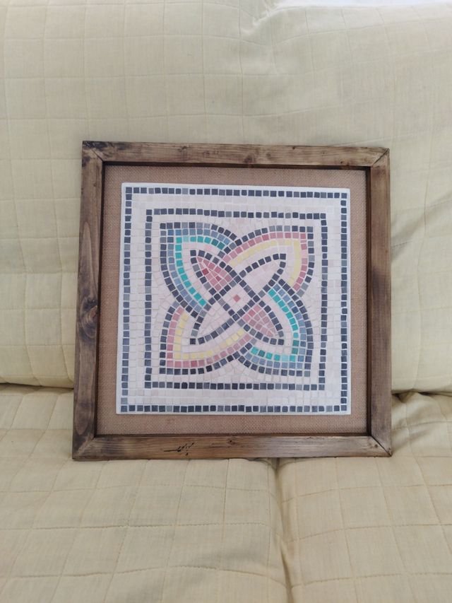 Precioso mosaico de estilo romano, con un diseño geométrico y colores vibrantes. - Medidas: 40x40 cm. - Marco de madera rústica.