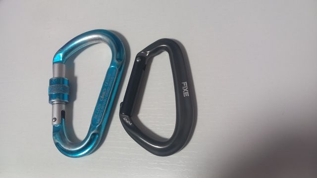 Detalles del productoDos mosquetones de escalada, uno de color azul y otro negro.