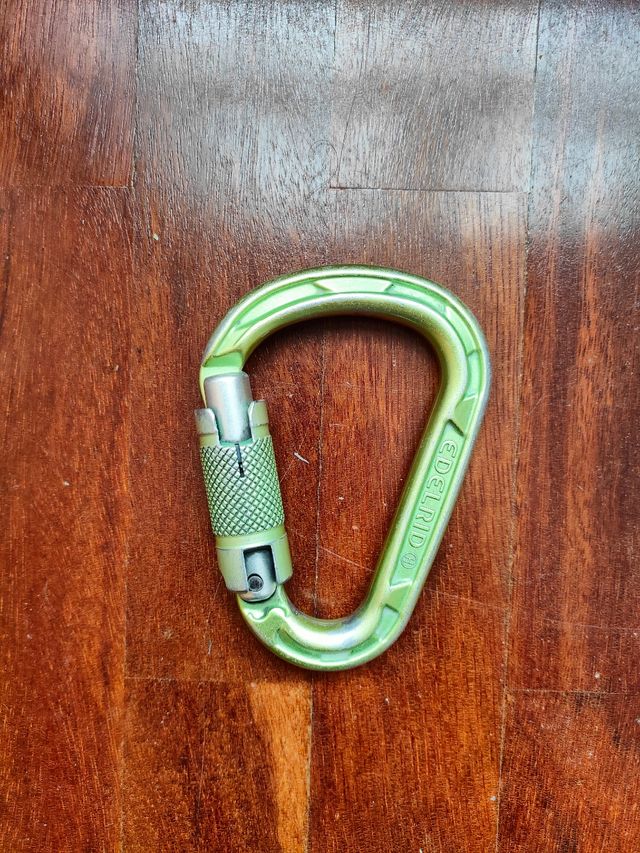 Detalles del productoSe venden 22 mosquetones HMS con cierre automático y de rosca. Están usados y el muelle ya no va fino, por lo que no se recomiendan para escalada ni seguridad. Aún aguantan bien para usos secundarios.
