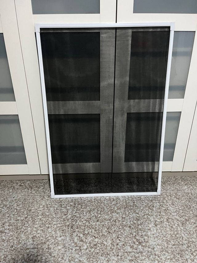 Mosquitera corredera con marco blanco. - Malla oscura. - Diseño con divisiones verticales y horizontales.