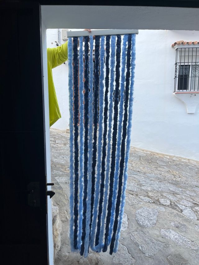 Mosquitera para autocaravana, ideal para mantener los insectos fuera. - Fabricada con tiras de hilo de color azul y negro. - Diseño de cortina.