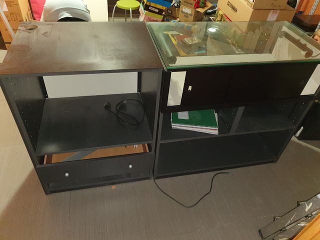 Detalles del productoMueble mostrador en dos piezas color nogal blanco y naranja en madera de calidad con laterales metálicos y un escaparate con luz.