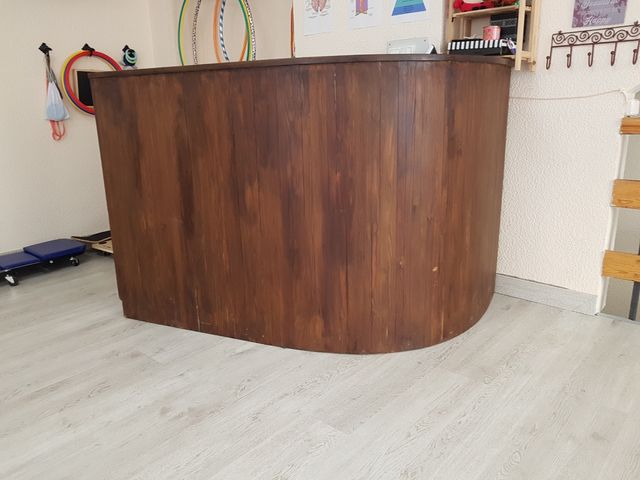 Detalles del productomostrador o pequeña barra de bar de madera maciza de pino con cuatro apartados diferenciados y un cajón.