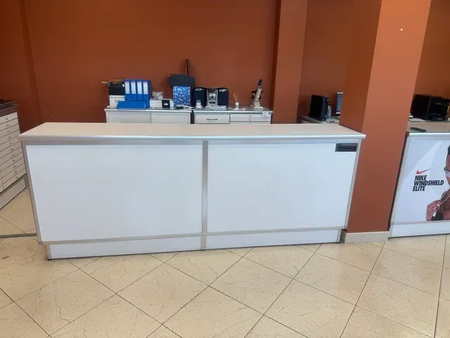 Detalles del productoMostrador blanco versátil, ideal para cualquier tipo de negocio. Con muchisimos cajones y cristales protectores. El recto mide 252cms de anchoX100cms de alto y 50cms de fondo. El que tiene forma de L (en la imagen el que tiene el ordenador detrás de la vitrina) mide igual de alto y fondo y las medidas de la L son lado largo 110cms y el corto 80cms.
