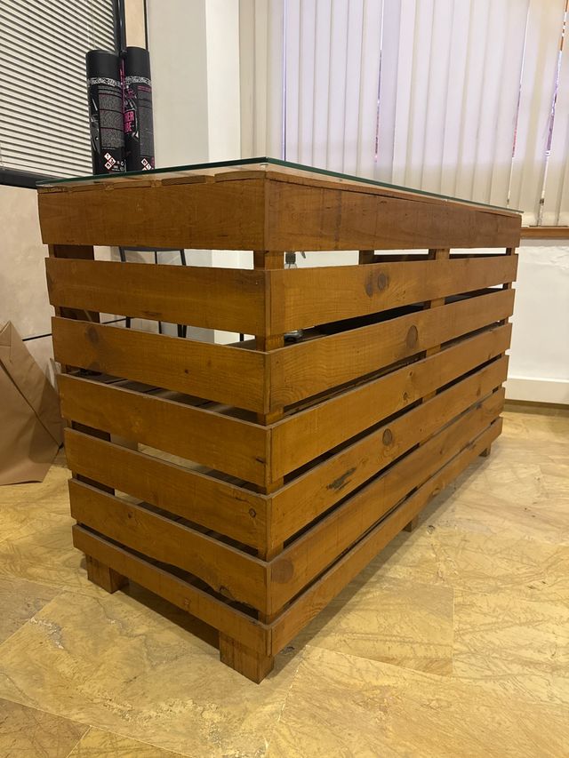 Mostrador de madera barnizada con tapa de cristal. - Diseño de listones de madera. - Estructura robusta.