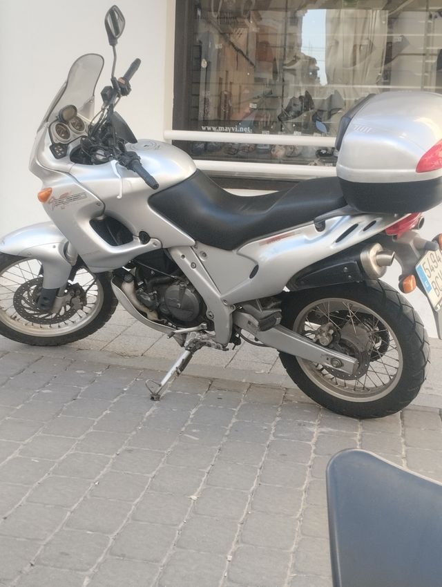 Moto de carretera de 650cc en color plata. - Diseño deportivo y aerodinámico. - Asiento cómodo para el conductor y pasajero. - Maleta trasera incluida.