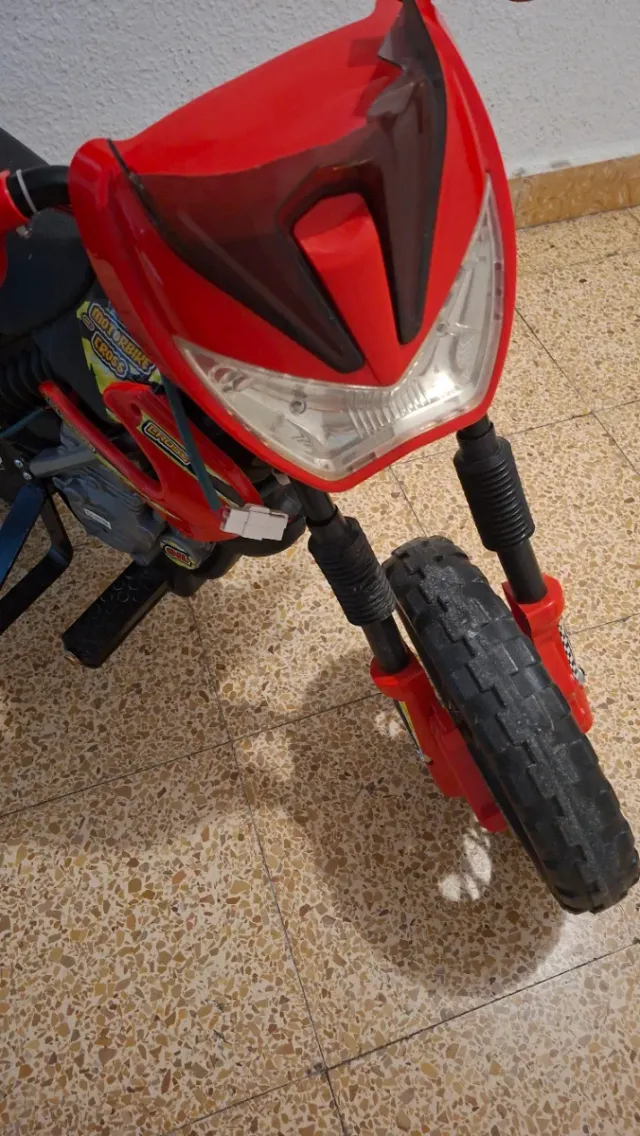 Moto a batería para niños con un diseño deportivo y llamativo. - Color rojo vibrante. - Estilo de moto de cross.