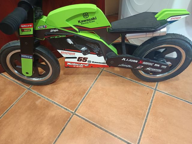 Preciosa moto-bici para niños, réplica Kawasaki. Está en muy buen estado y lista para usar. - Diseño réplica Kawasaki. - Llantas de goma. - Asiento cómodo.