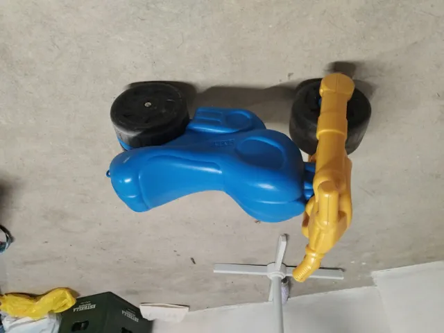 Moto correpasillos de plástico en color azul y amarillo. - Diseño divertido para los más pequeños. - Ruedas negras. - Manillar amarillo.