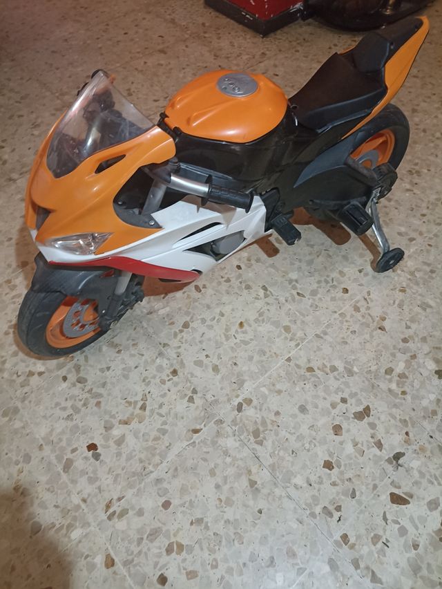 Moto de batería para niños, ideal para paseos divertidos. - Color naranja y blanco. - Ruedines de apoyo incluidos. - Requiere cargador de 12V (no incluido).