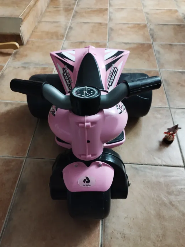Detalles del productoMoto eléctrica infantil de color rosa con diseño deportivo.
