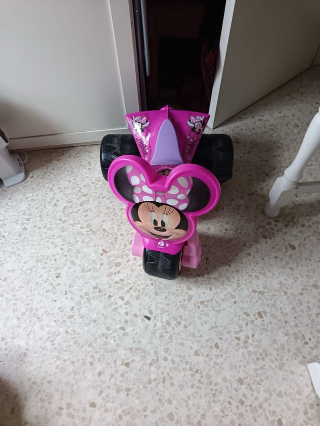 Moto eléctrica infantil con diseño de Minnie Mouse. - Color rosa y morado. - Ruedas negras. - Detalle de Minnie en la parte frontal. -Carga eléctrica por batería