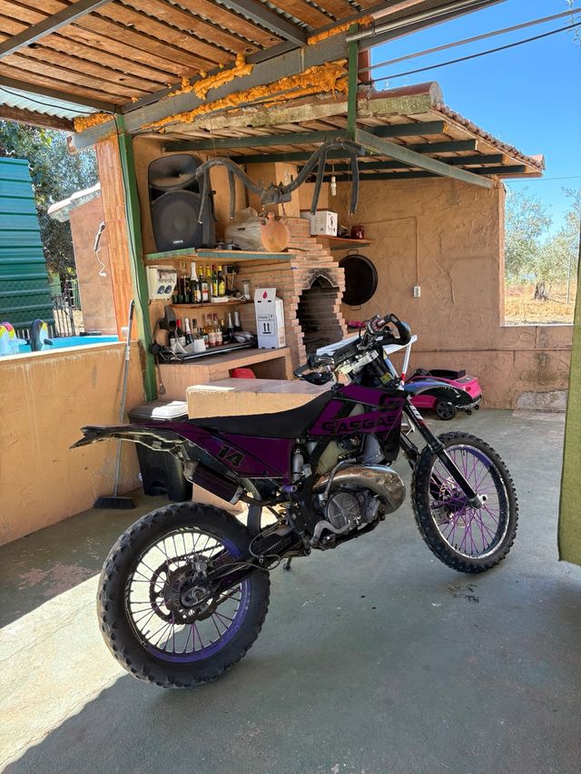 Moto de enduro Gas Gas de 250cc y 2 tiempos. Color morado con detalles. Revisión recién pasada