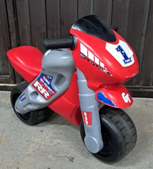Moto de plástico para niños de la marca Feber. Diseño deportivo en color rojo. - Ruedas de goma. - Asiento cómodo. - Manillar con puños.