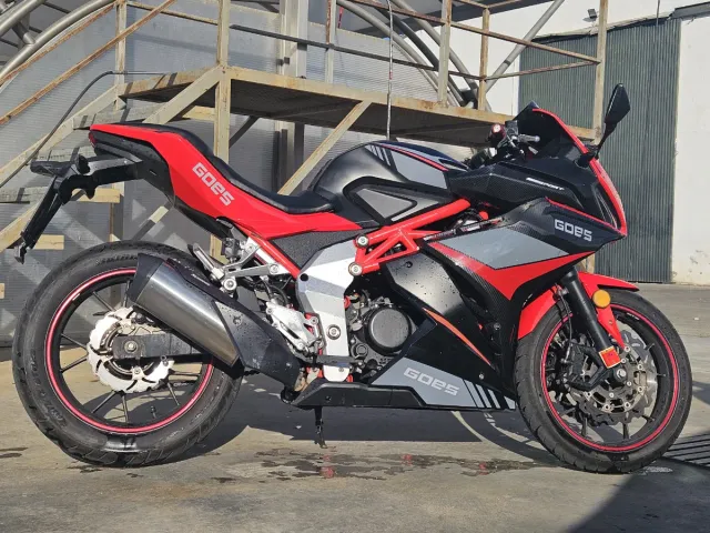 Moto deportiva GOES 125, apta para conducir con el carnet B. Diseño moderno y dinámico. - Colores: Rojo, negro y gris. - Ruedas con aro rojo. - Escape deportivo.
